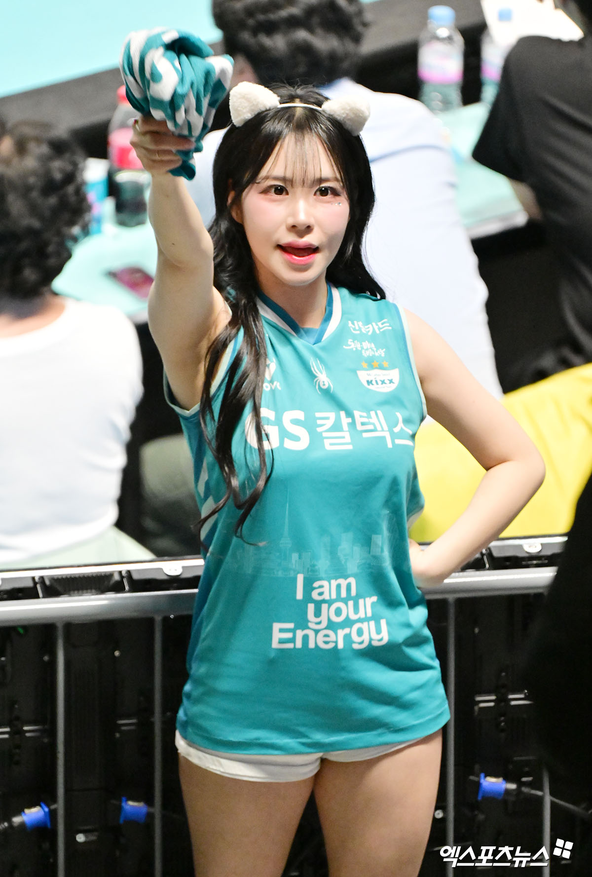(엑스포츠뉴스 장충, 김한준 기자) 6일 오후 서울 장충체육관에서 열린 '진에어 2025-2026 V-리그' GS칼텍스와 페퍼저축은행의 경기, 남화륜 치어리더가 열띤 응원을 선보이고 있다.