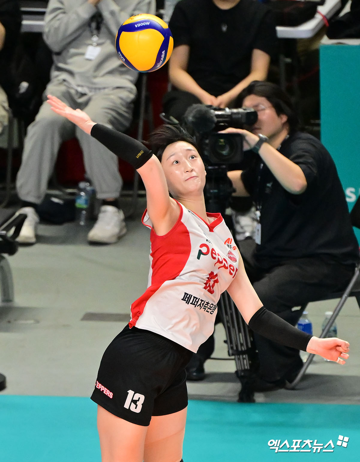 (엑스포츠뉴스 장충, 김한준 기자) 6일 오후 서울 장충체육관에서 열린 '진에어 2025-2026 V-리그' GS칼텍스와 페퍼저축은행의 경기, 페퍼저축은행 박은서가 공격을 시도하고 있다.