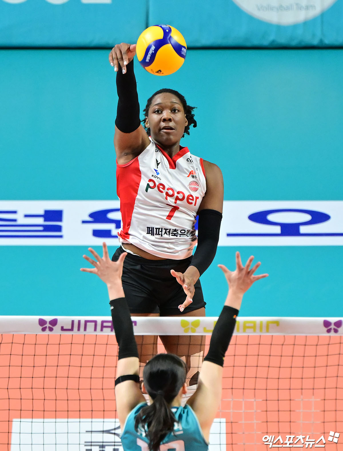 (엑스포츠뉴스 장충, 김한준 기자) 6일 오후 서울 장충체육관에서 열린 '진에어 2025-2026 V-리그' GS칼텍스와 페퍼저축은행의 경기, 페퍼저축은행 조이가 공격을 시도하고 있다.