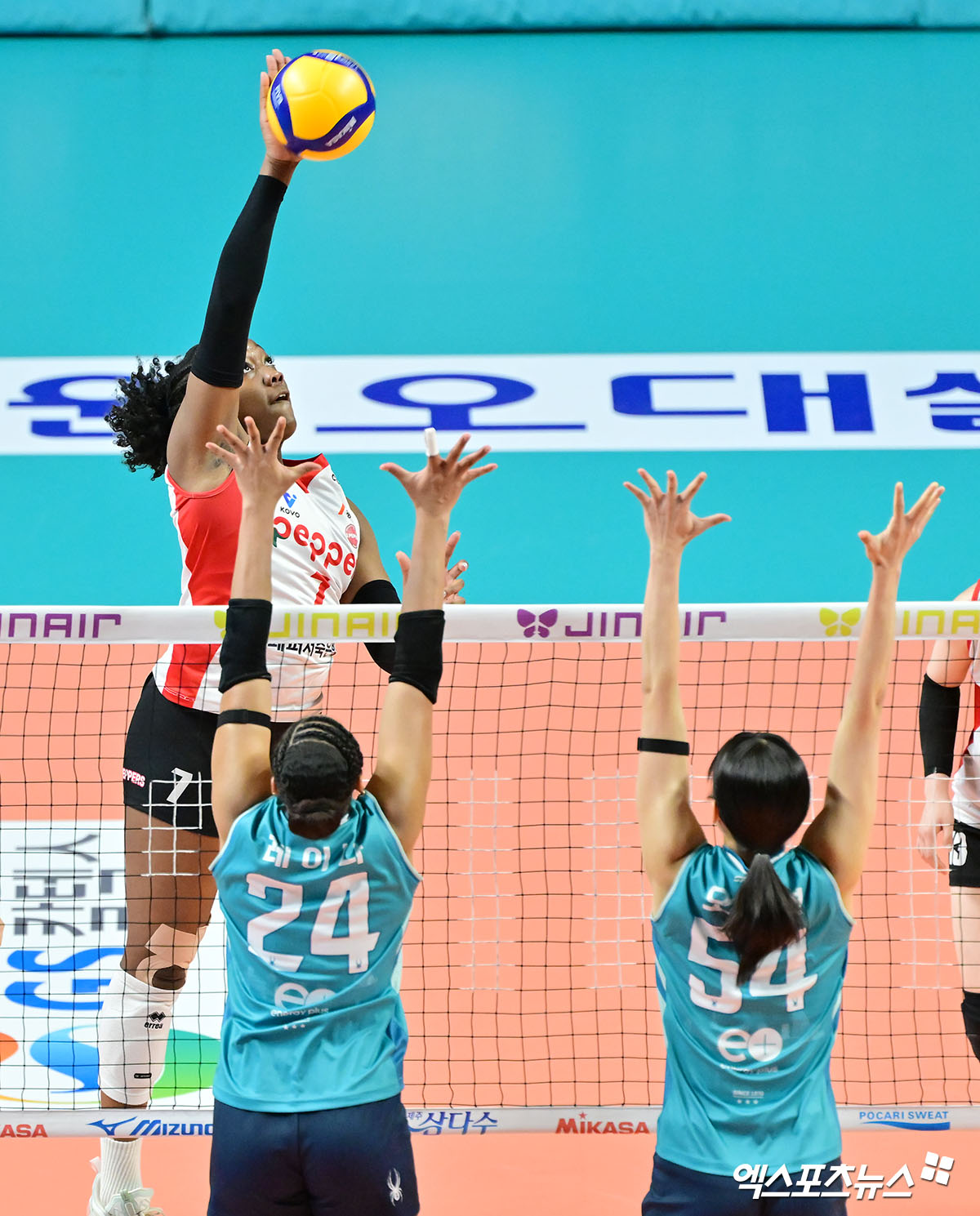(엑스포츠뉴스 장충, 김한준 기자) 6일 오후 서울 장충체육관에서 열린 '진에어 2025-2026 V-리그' GS칼텍스와 페퍼저축은행의 경기, 페퍼저축은행 조이가 공격을 시도하고 있다.
