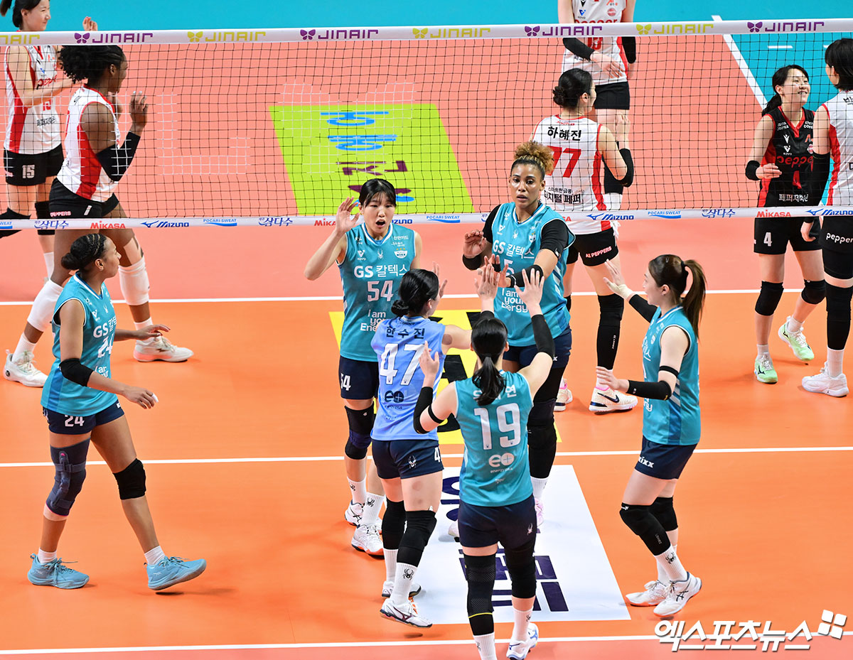 (엑스포츠뉴스 장충, 김한준 기자) 6일 오후 서울 장충체육관에서 열린 '진에어 2025-2026 V-리그' GS칼텍스와 페퍼저축은행의 경기, GS칼텍스 선수들이 득점 후 기뻐하고 있다.