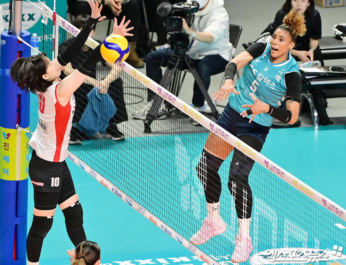(엑스포츠뉴스 장충, 김한준 기자) 6일 오후 서울 장충체육관에서 열린 '진에어 2025-2026 V-리그' GS칼텍스와 페퍼저축은행의 경기, GS칼텍스 실바가 공격을 시도하고 있다.
