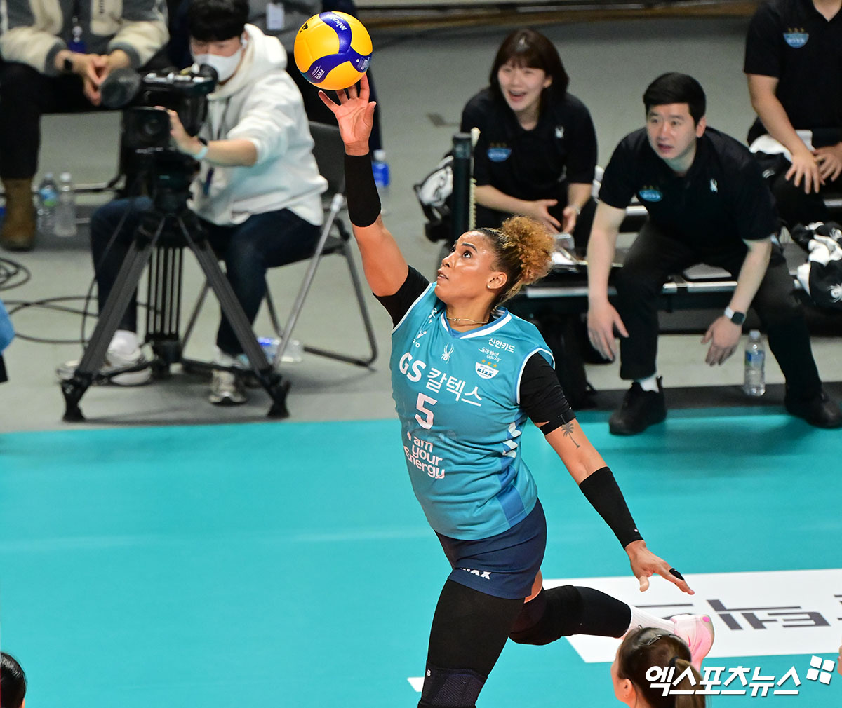 (엑스포츠뉴스 장충, 김한준 기자) 6일 오후 서울 장충체육관에서 열린 '진에어 2025-2026 V-리그' GS칼텍스와 페퍼저축은행의 경기, GS칼텍스 실바가 공격을 시도하고 있다.