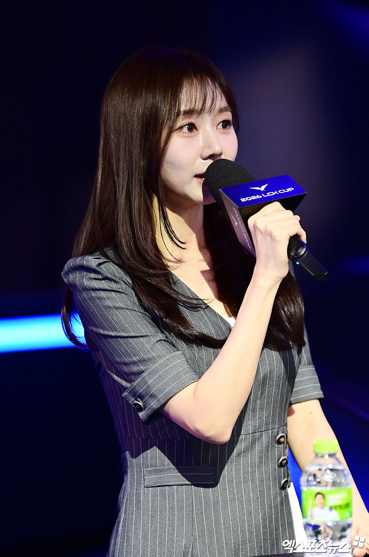 (엑스포츠뉴스 박지영 기자) 7일 오후 서울 청진동 롤파크에서 열린 '2026 LCK컵 미디어데이'에 참석한 윤수빈 아나운서가 인사하고 있다.