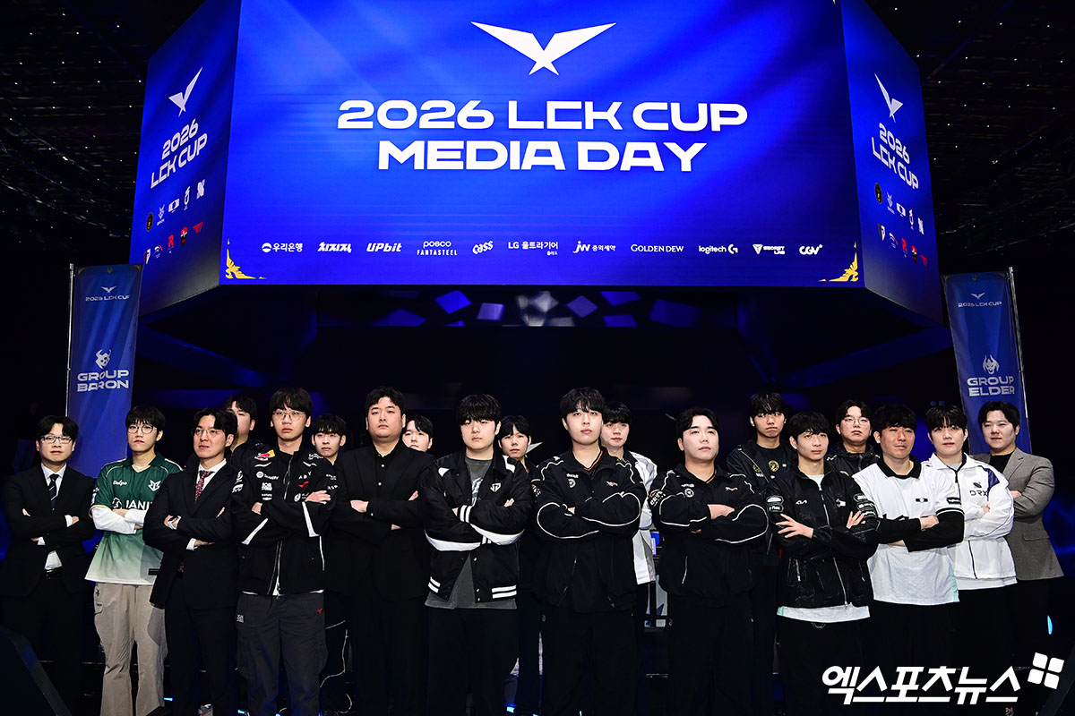 (엑스포츠뉴스 박지영 기자) 7일 오후 서울 청진동 롤파크에서 열린 '2026 LCK컵 미디어데이'에 참석한 10개팀 감독과 대표선수들이 기념 촬영을 하고 있다.