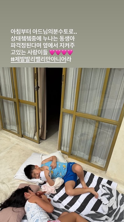 7일 김빈우는 자신의 개인 계정에 "아침부터 아드님의 분수토로.. 상태 체크 중에 누나는 동생 아파 걱정 된다며 옆에서 지켜주고 있는 사랑이들♥"리나는 글을 게재했다.