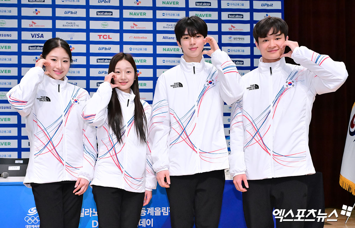 (엑스포츠뉴스 진천, 김한준 기자) 7일 오후 충북 대한체육회 진천국가대표선수촌에서 열린 2026 밀라노코르티나동계올림픽대회 D-30 훈련공개, 피겨 이해인 신지아 차준환 김현겸이 포즈를 취하고 있다.