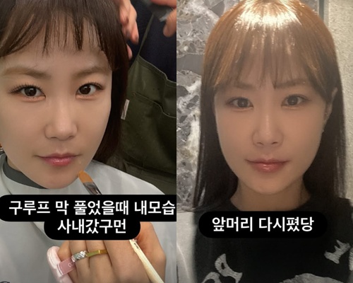 공개된 사진 속 김지민은 헤어와 메이크업을 받는 과정에서 앞머리를 내린 모습과 다시 정리한 모습을 연이어 공개해 비교하는 재미를 더했다.