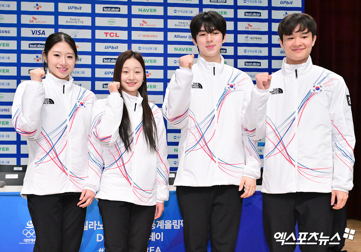 (엑스포츠뉴스 진천, 김한준 기자) 7일 오후 충북 대한체육회 진천국가대표선수촌에서 열린 2026 밀라노코르티나동계올림픽대회 D-30 훈련공개, 피겨 이해인 신지아 차준환 김현겸이 포즈를 취하고 있다.