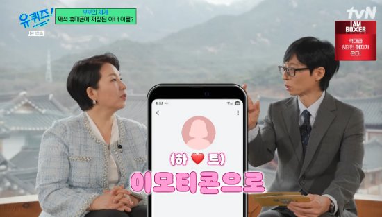 이호선은 유재석에게 "아내분을 어떻게 저장해 놓으셨냐"고 했고, 유재석은 "하트 이모티콘으로 해놨다. 그렇게 해놓으면 대외적으로도 전화 왔을 때..."라면서 웃음을 참지 못했다.