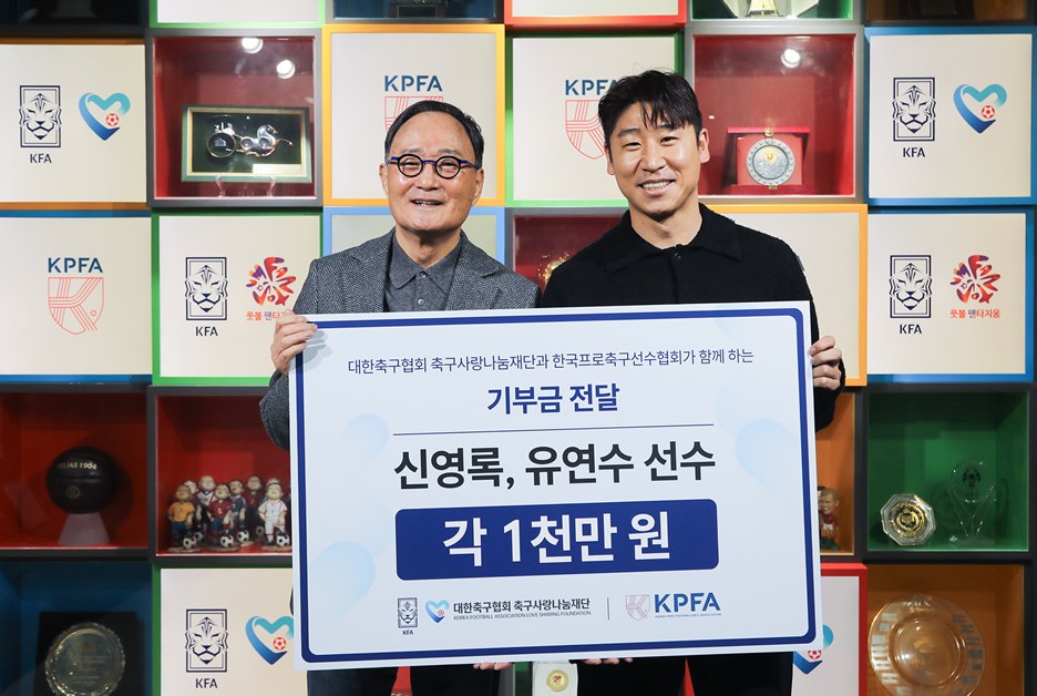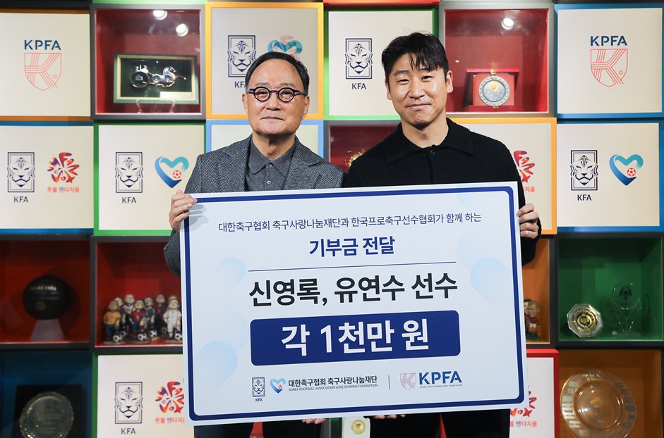 양 기관은 8일 대한축구협회 풋볼팬타지움에서 기부금 전달식을 갖고, 신영록, 유연수의 재활 지원을 위해 총 2천만 원의 기부금을 전달했다고 밝혔다.