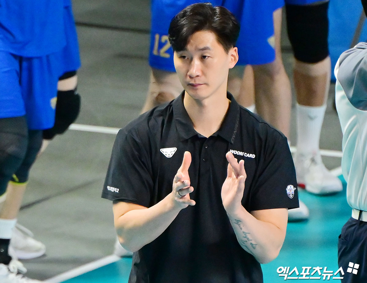(엑스포츠뉴스 장충, 김한준 기자) 8일 오후 서울 장충체육관에서 열린 '진에어 2025-2026 V-리그' 우리카드와 대한항공의 경기, 우리카드 박철우 감독대행이 박수를 치고 있다.