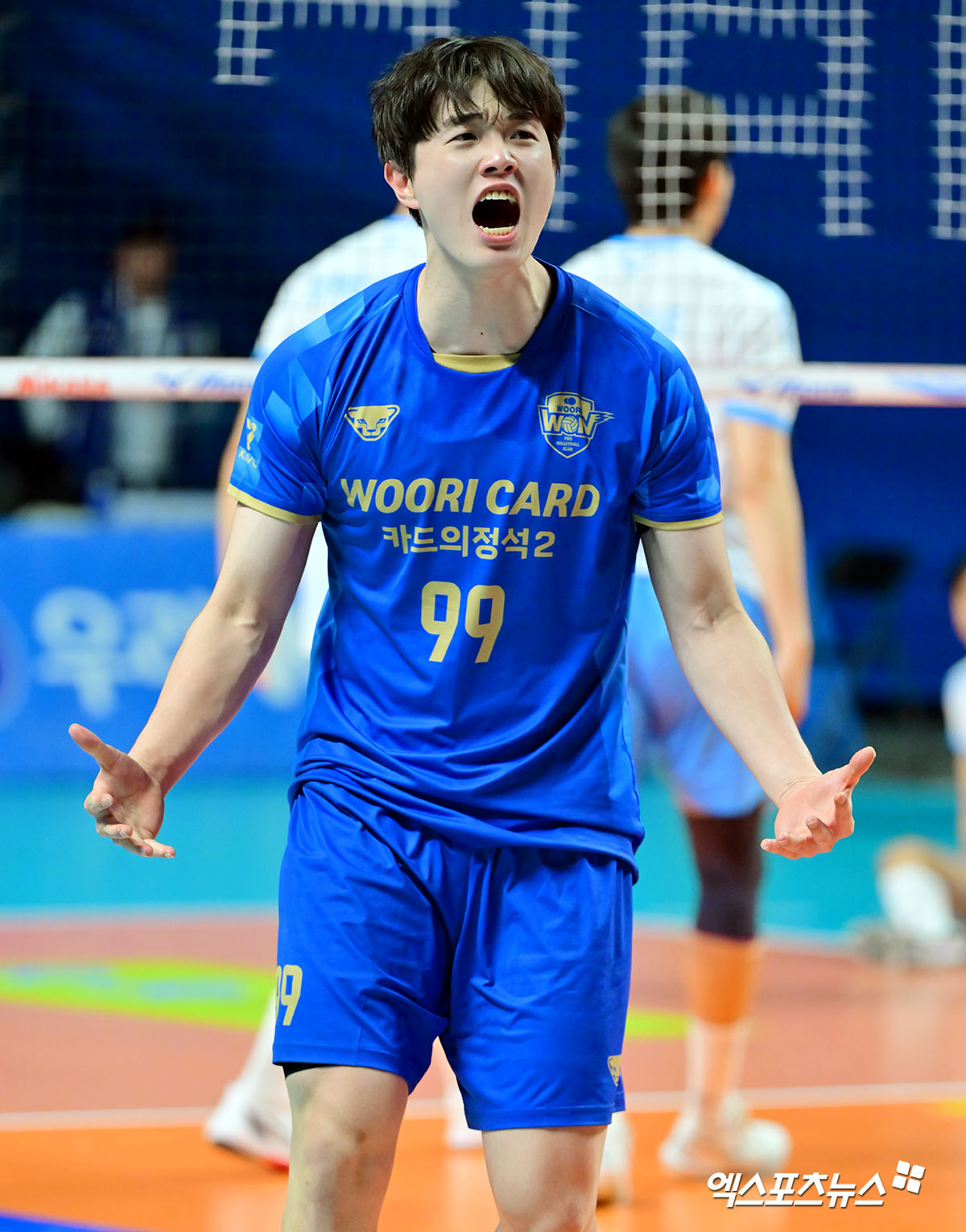 (엑스포츠뉴스 장충, 김한준 기자) 8일 오후 서울 장충체육관에서 열린 '진에어 2025-2026 V-리그' 우리카드와 대한항공의 경기, 우리카드 김지한이 득점 후 기뻐하고 있다.