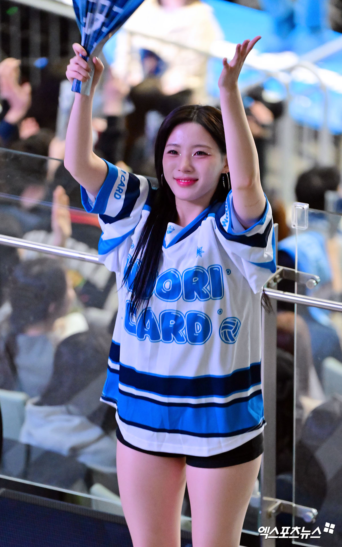 (엑스포츠뉴스 장충, 김한준 기자) 8일 오후 서울 장충체육관에서 열린 '진에어 2025-2026 V-리그' 우리카드와 대한항공의 경기, 하지원 치어리더가 열띤 응원을 선보이고 있다.