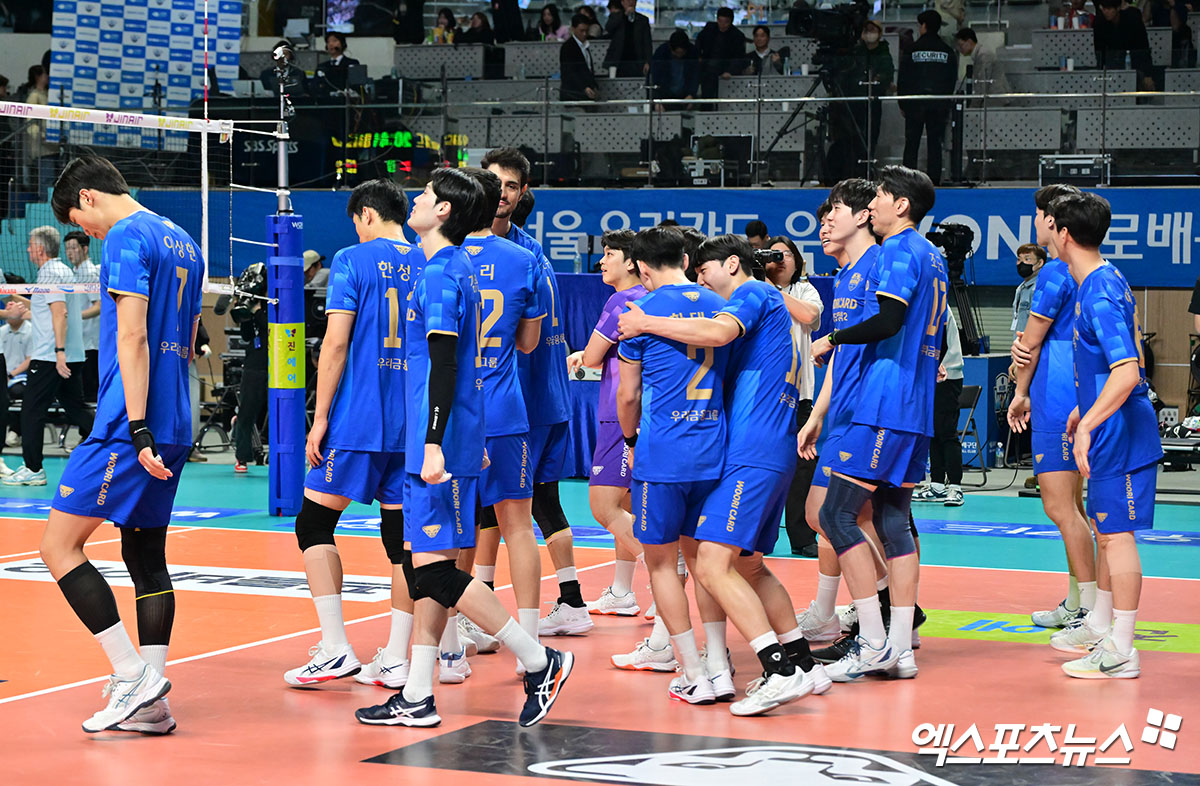 이날 경기에서 승리한 우리카드 선수들이 기뻐하고 있다.