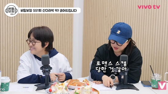김숙이 "그러니까 사진이 하나도 안 찍힌 거 아니냐"고 하자, 산다라박은 "맞다. 그래서 나는 사이버 러버였다"고 고백했다. 그러자 김숙은 "아무래도 로맨스스캠 당한 것 같다"고 농담을 건넸다.