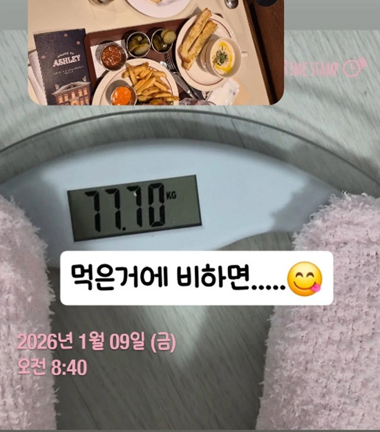 공개된 사진 속에는 체중계에 표시된 77.7kg라는 숫자가 담겨 있어 눈길을 끌었다. 이는 과거 최고 체중과 비교했을 때 놀라운 변화로, 여전히 체중을 안정적으로 유지하고 있음을 보여준다.