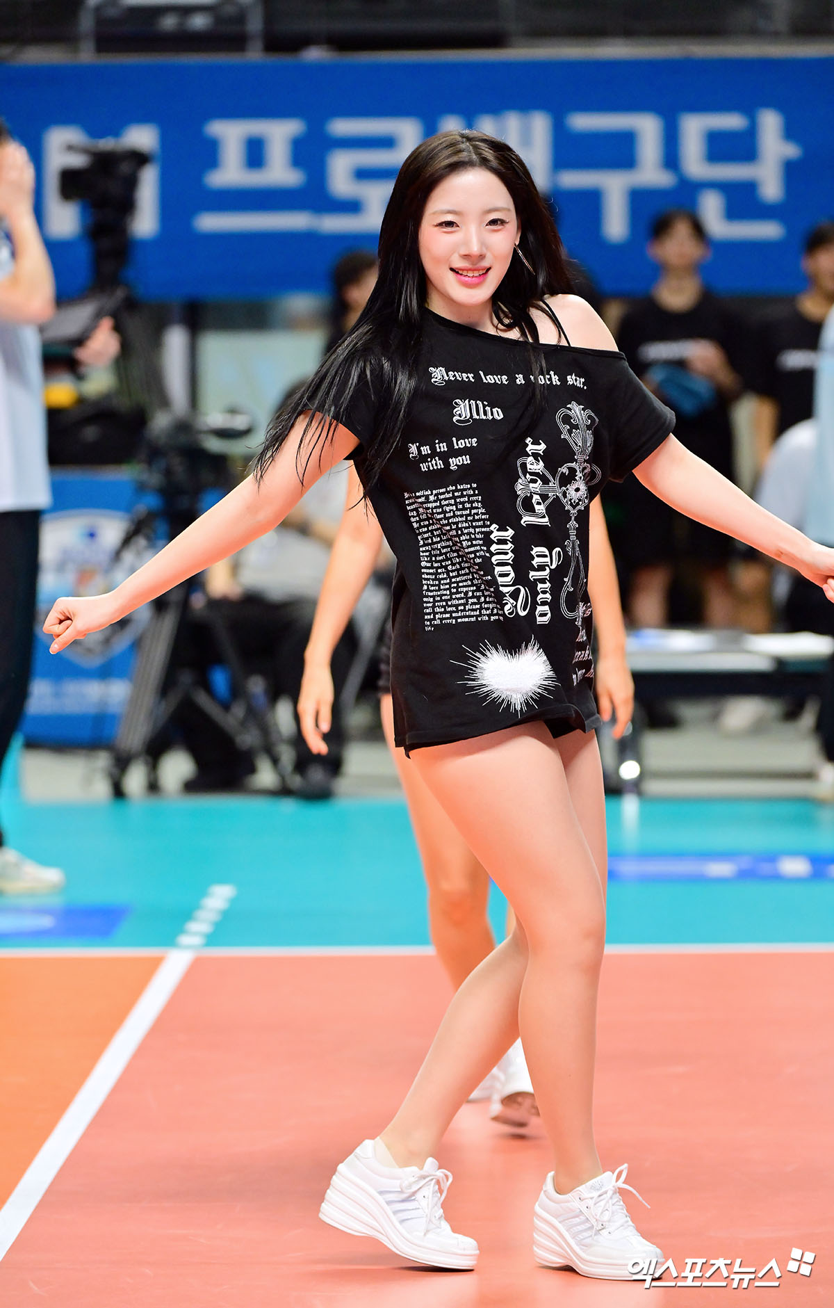 하지원은 8일 오후 서울 장충체육관에서 열린 '진에어 2025-2026 V-리그' 우리카드와 대한항공의 경기에서 남다른 춤 실력을 뽐냈다.
