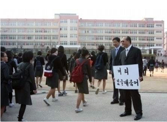 공개된 사진을 보면 한 학교의 선생님이 학생들의 등교 시간에 교문 앞에서 지도를 하며 '머리 있을 때 묶어'라는 팻말을 들고 서 있다.