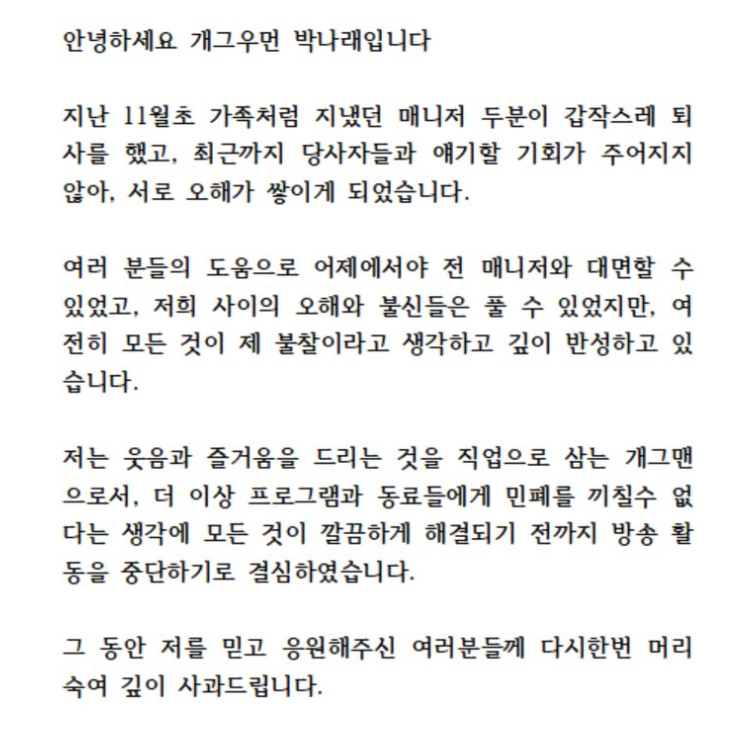앞서 박나래는 지난달 8일 전 매니저와 대면했음을 고백, 오해와 불신을 풀었다며 "여전히 모든 것이 제 불찰이라고 생각하고 깊이 반성하고 있다"며 활동 중단을 선언했다.