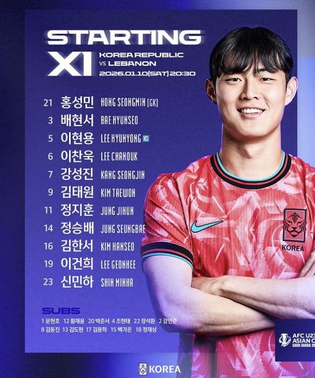 이민성 감독이 이끄는 대한민국 23세 이하(U-23) 축구대표팀은 10일 오후 8시30분(한국시간)부터 사우디아라비아 리야드 알 샤밥 클럽 경기장에서 2026 아시아축구연맹(AFC) U-23 아시안컵 조별리그 2차전을 치르고 있다. 상대는 레바논이다.