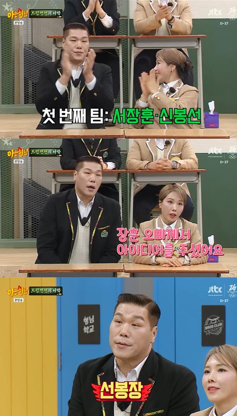 이날 게스트들은 아는 형님 멤버들과 짝을 이뤄 팀을 결성했다. 첫 번째 팀은 유일한 여성 게스트 신봉선과 서장훈이었다. 팀명이 무엇이냐는 질문에 신봉선은 "장훈 오빠께서 아이디어를 주셨다"며 '선봉장'이라는 팀명을 공개했다.