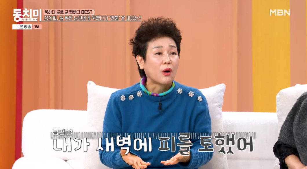 그러면서 "한 번은 술 먹고 왔는데 자는 척을 했다. 아침에 봤더니 울고 있더라. 남자가 우는 거 처음 봤다. '내가 폐병 같아' 이러더라. '네가 의사냐. 왜 그렇게 얘기 하냐'고 힜던 '내가 새벽에 피를 토했어' 이러더라. 아무리 남편이 미워도 가슴이 철렁 하더라"면서 남편이 만취 후 각혈을 했다고 설명했다.