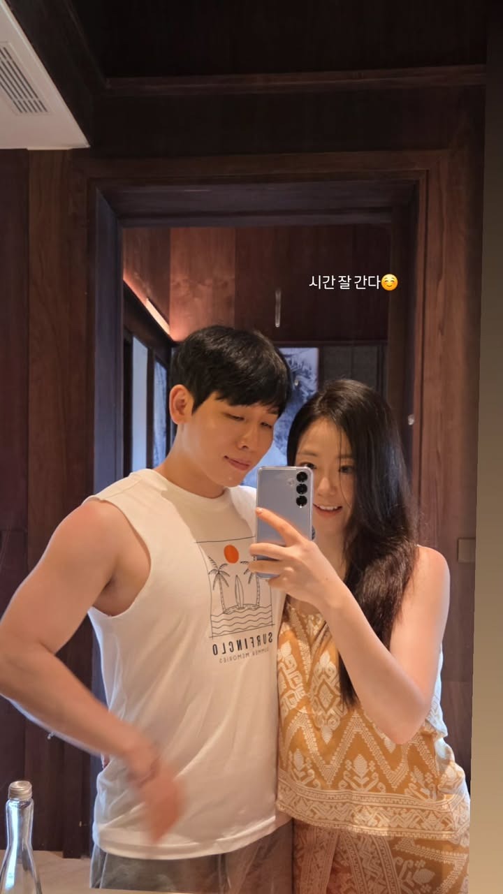 또 다른 사진에서는 "시간 잘 간다"는 글과 함께 리조트 내부의 거울에서 다정하게 포즈를 취한 모습을 공개해 훈훈함을 자아냈다.