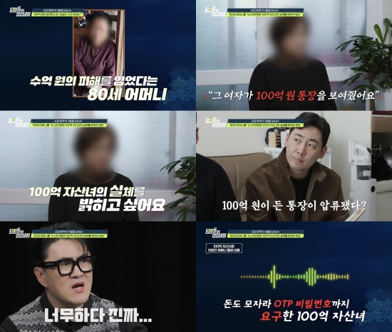 "아버지는 H건설 사장, 어머니는 갤러리 관장"이라고 자신을 소개한 여성은, '100억 원'이 찍힌 통장을 직접 보여주며 두 사람의 빚을 대신 갚겠다고 나섰다. 그런데 "보증을 잘못 서 통장이 압류가 된 상태"라며, 압류 해지를 위한 자금이 필요하다고 덧붙였다. 그때부터 100억 원 자산녀는 '빌려달라'는 명목으로 의뢰인 어머니의 모든 현금 자산을 가져가더니, 돈이 바닥나자 지인들의 돈까지 끌어오도록 압박했다. 뿐만 아니라 어머니가 은행 대출을 받도록 유도하고, 텔레뱅킹 비밀번호를 요구해 어머니의 계좌에서 직접 돈을 빼가는 등 할 수 있는 모든 수법을 동원해 돈을 빼앗았다.