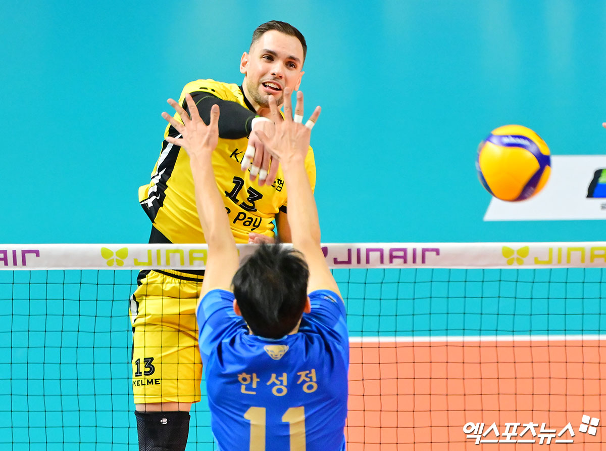 (엑스포츠뉴스 장충, 김한준 기자) 11일 오후 서울 장충체육관에서 열린 '진에어 2025-2026 V-리그' 우리카드와 KB손해보험의 경기, KB손해보험 비예나가 공격을 시도하고 있다.