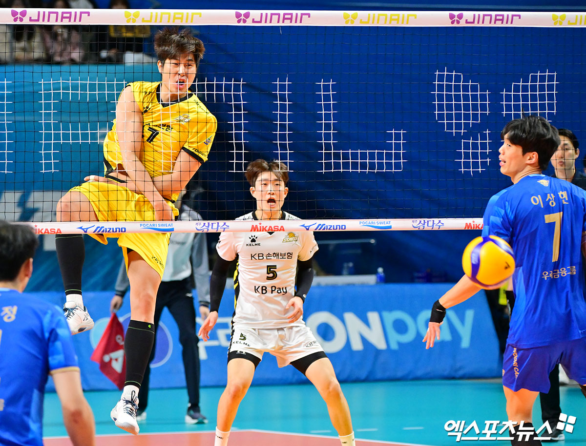 (엑스포츠뉴스 장충, 김한준 기자) 11일 오후 서울 장충체육관에서 열린 '진에어 2025-2026 V-리그' 우리카드와 KB손해보험의 경기, KB손해보험 박상하가 공격을 시도하고 있다.