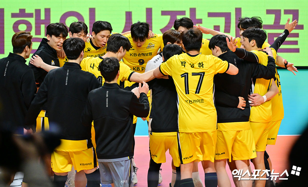 이날 경기에서 승리한 KB손해보험 선수들이 기뻐하고 있다.