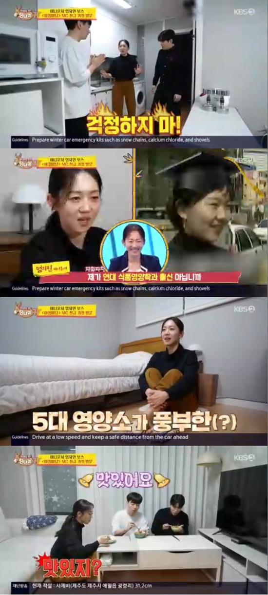 엄지인은 마요네즈, 된장이 킥이라며 김치볶음밥 비법을 알려줬다. 엄지인은 "이렇게 요리해주는 선배가 어디 있느냐"고 생색을 냈다.