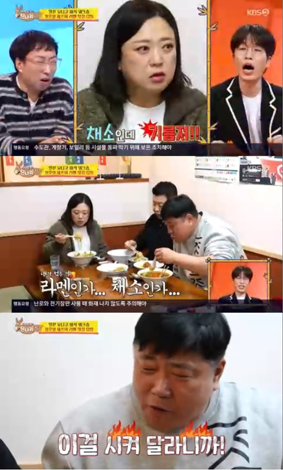 채소 라멘을 먹게 된 김숙은 "채소가 많아서 면을 찾을 수가 없다. 채소인데 기름지다. 건강한 느낌도 아니다. 채소가 기름에 코팅되어 있다"고 불평했다.