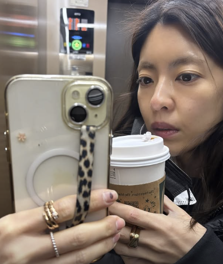 공개된 사진 속 이윤지는 엘리베이터 거울에 비친 자신의 모습을 핸드폰 카메라로 담고 있는 모습. 계단에서 넘어져 생긴 손톱 멍이 선명하게 드러난다.