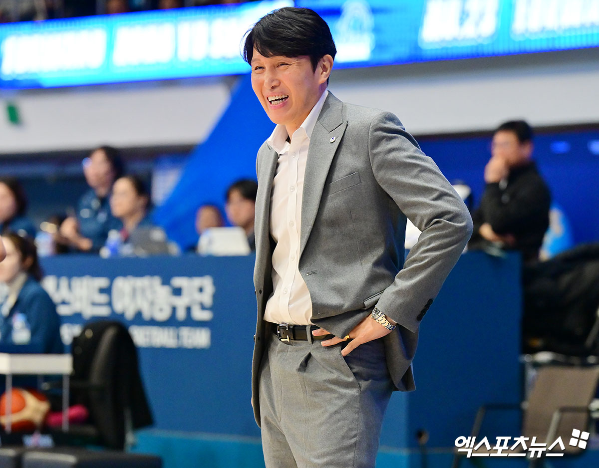 (엑스포츠뉴스 인천, 김한준 기자) 12일 오후 인천광역시 중구 도원체육관에서 열린 'BNK 금융 2025-2026 여자프로농구' 신한은행과 우리은행의 경기, 우리은행 위성우 감독이 심판 판정에 아쉬워하고 있다.