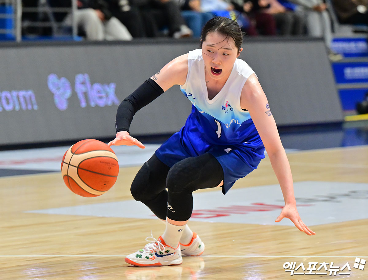 (엑스포츠뉴스 인천, 김한준 기자) 12일 오후 인천광역시 중구 도원체육관에서 열린 'BNK 금융 2025-2026 여자프로농구' 신한은행과 우리은행의 경기, 신한은행 신이슬이 루즈볼을 잡기 위해 달려가고 있다.