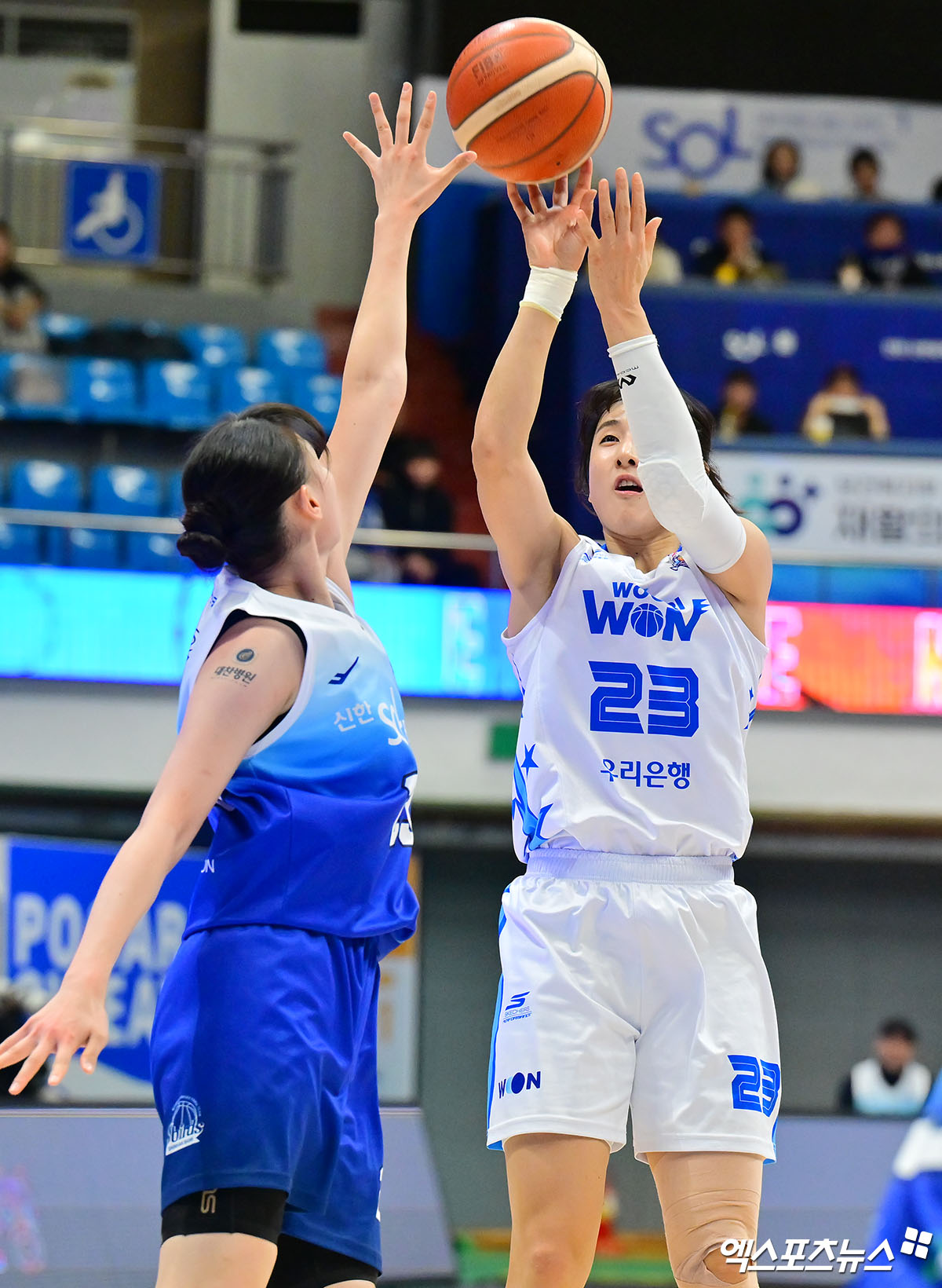 (엑스포츠뉴스 인천, 김한준 기자) 12일 오후 인천광역시 중구 도원체육관에서 열린 'BNK 금융 2025-2026 여자프로농구' 신한은행과 우리은행의 경기, 우리은행 김단비가 점프슛를 시도하고 있다.
