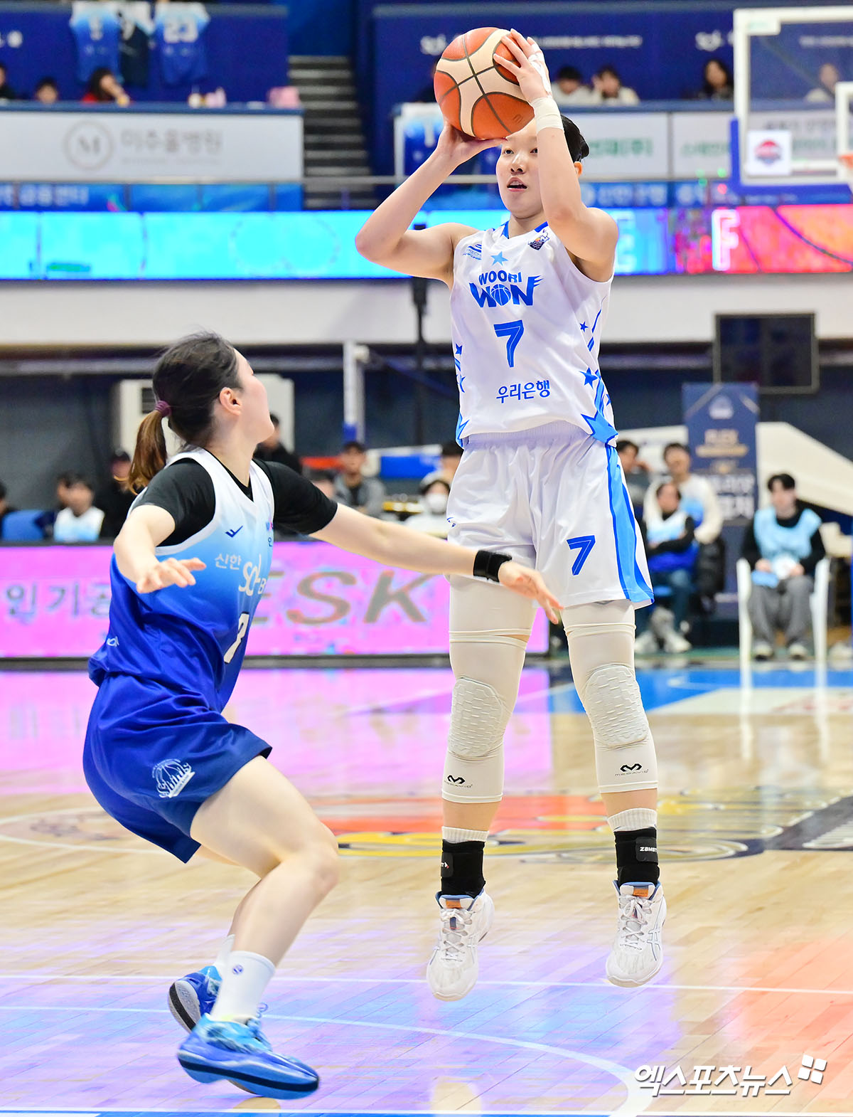 (엑스포츠뉴스 인천, 김한준 기자) 12일 오후 인천광역시 중구 도원체육관에서 열린 'BNK 금융 2025-2026 여자프로농구' 신한은행과 우리은행의 경기, 우리은행 이민지가 점프슛를 시도하고 있다.