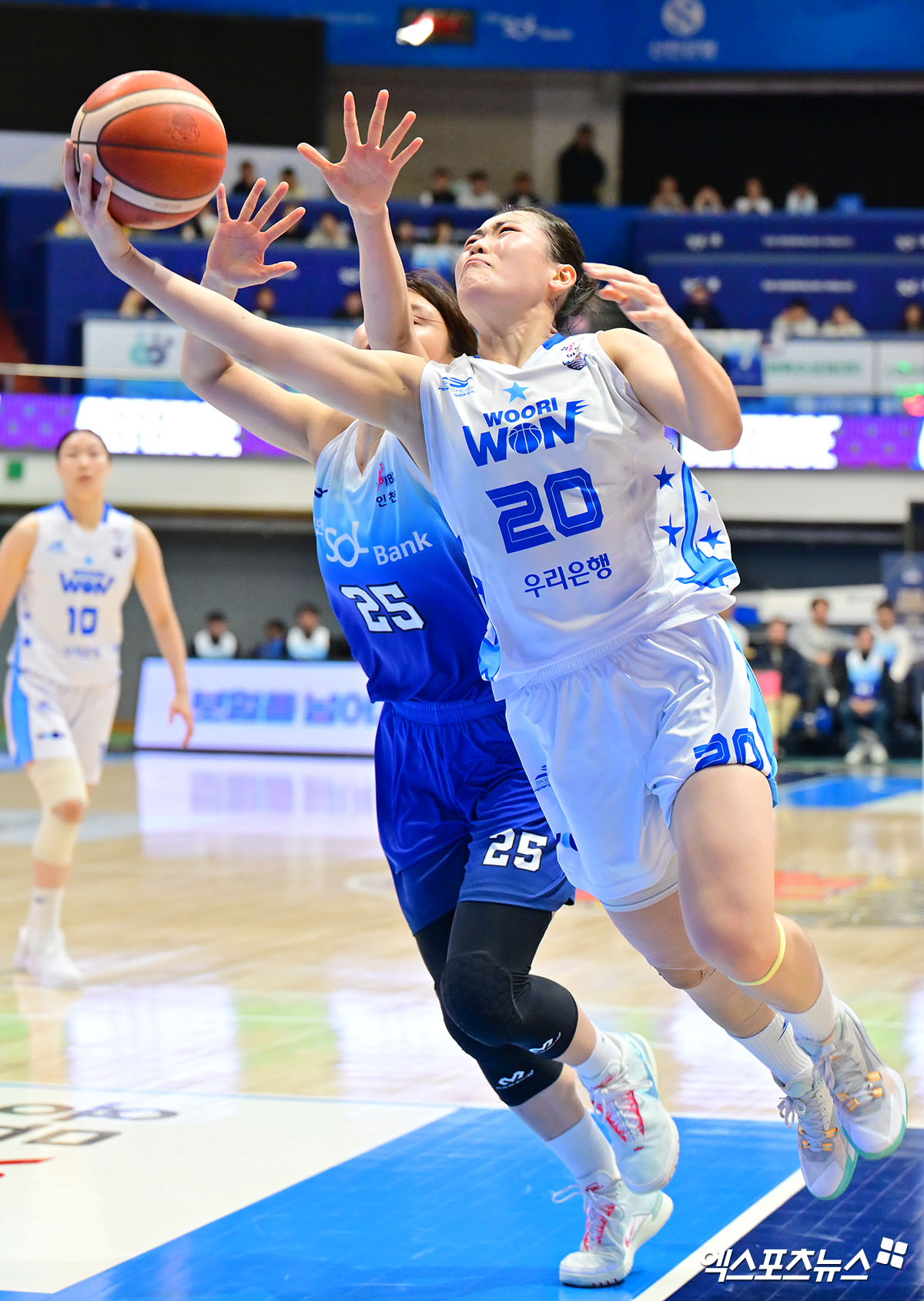 (엑스포츠뉴스 인천, 김한준 기자) 12일 오후 인천광역시 중구 도원체육관에서 열린 'BNK 금융 2025-2026 여자프로농구' 신한은행과 우리은행의 경기, 우리은행 이명관이 레이업을 시도하고 있다.
