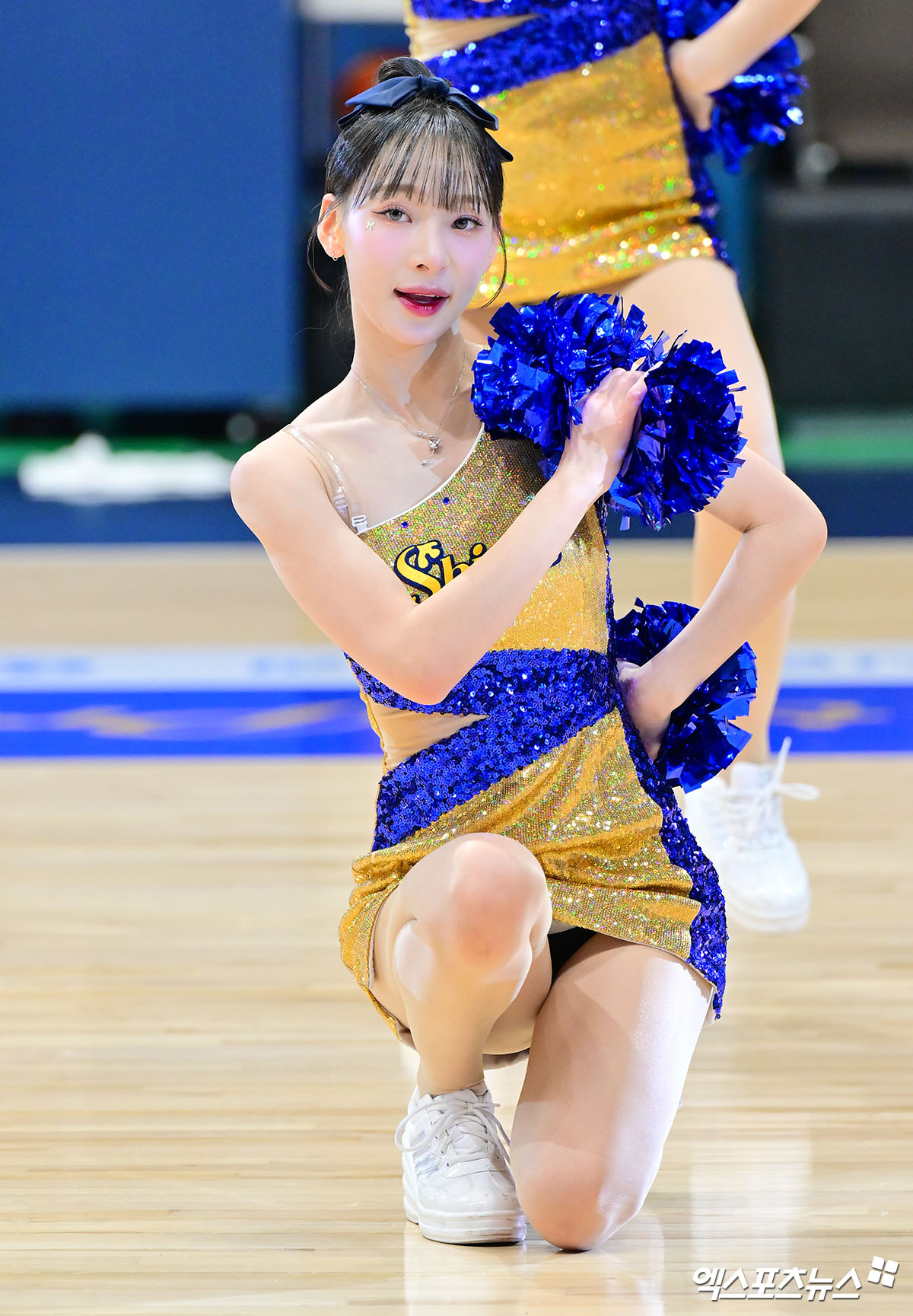 (엑스포츠뉴스 인천, 김한준 기자) 12일 오후 인천광역시 중구 도원체육관에서 열린 'BNK 금융 2025-2026 여자프로농구' 신한은행과 우리은행의 경기, 정희정 치어리더가 멋진 공연을 선보이고 있다.