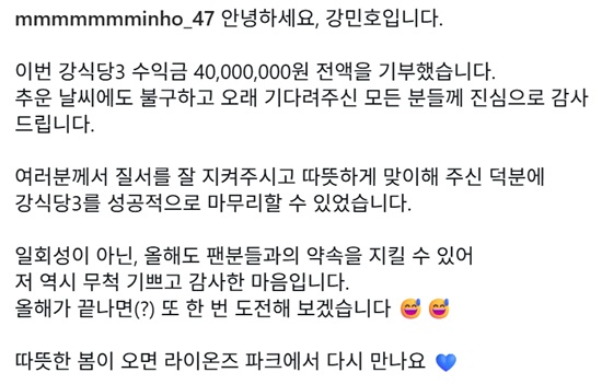 강민호는 SNS 계정을 통해 "안녕하세요, 강민호입니다. 이번 강식당3 수익금 40,000,000원 전액을 기부했습니다. 추운 날씨에도 불구하고 오래 기다려주신 모든 분들께 진심으로 감사드립니다. 여러분께서 질서를 잘 지켜주시고 따뜻하게 맞이해 주신 덕분에 강식당3를 성공적으로 마무리할 수 있었습니다"라고 전했다.