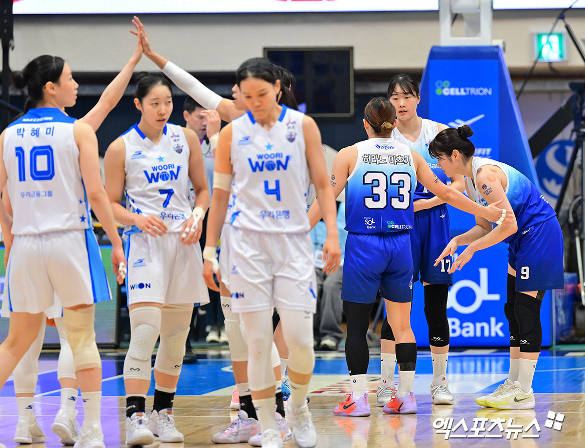 (엑스포츠뉴스 인천, 김한준 기자) 12일 오후 인천광역시 중구 도원체육관에서 열린 'BNK 금융 2025-2026 여자프로농구' 신한은행과 우리은행의 경기, 우리은행이 신한은행에 70:55로 승리했다.