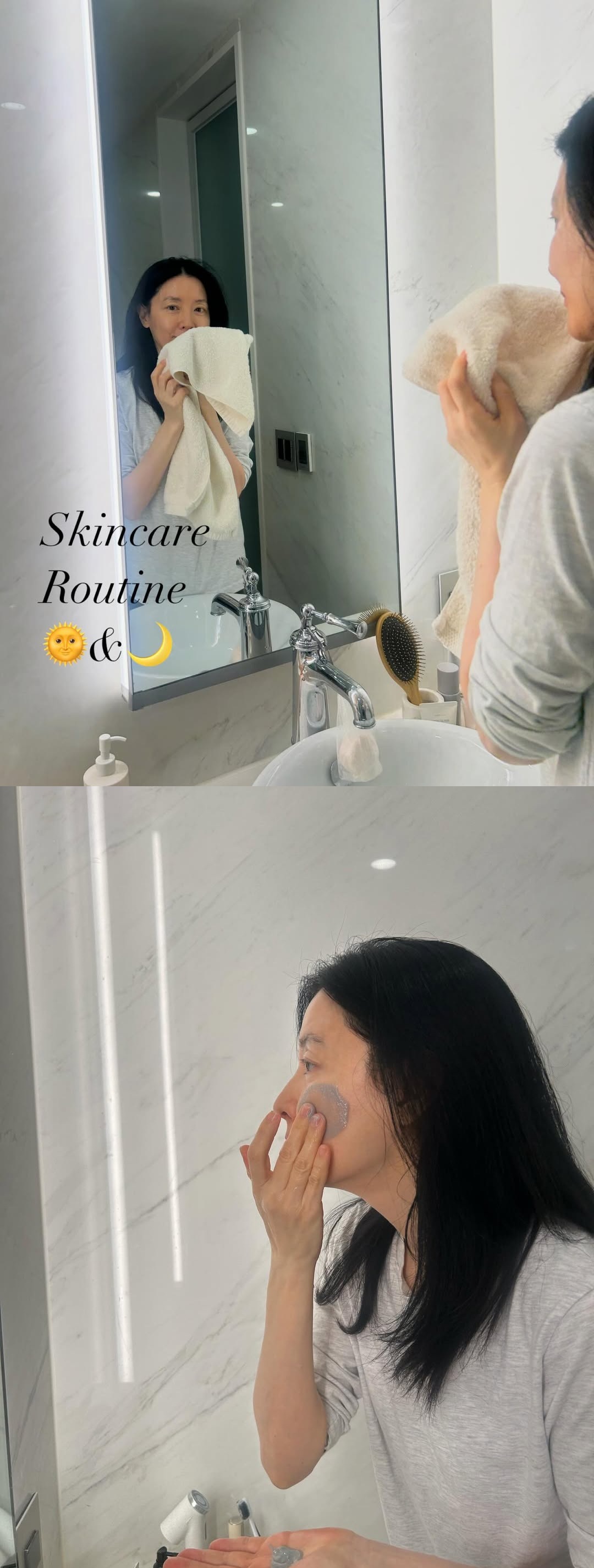 깔끔한 화장실과 각종 화장품이 놓인 세면대를 공개한 그는 자신이 쓰는 스크럽 제품부터 클렌저, 세안 단계 후 크림을 바르는 모습까지 모두 공개했다. 무결점 피부와 아름다운 비주얼이 감탄을 자아낸다.