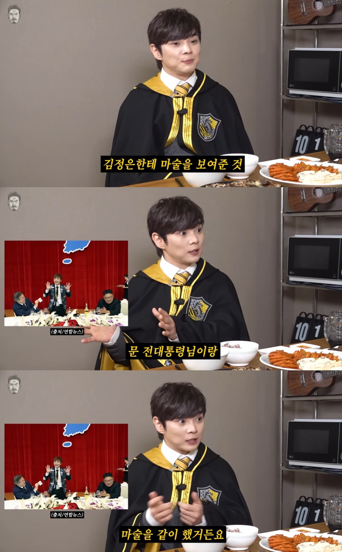 이날 꼰대희는 최현우에게 30년 간 마술을 하며 가장 기억에 남는 순간을 물었다. 이에 최현우는 "제가 평양에 가서 김정은에게 마술을 보여줬다. 정상회담 때 가서 문재인 전 대통령과 김정은 중간에서 같이 마술을 했다"고 운을 뗐다.