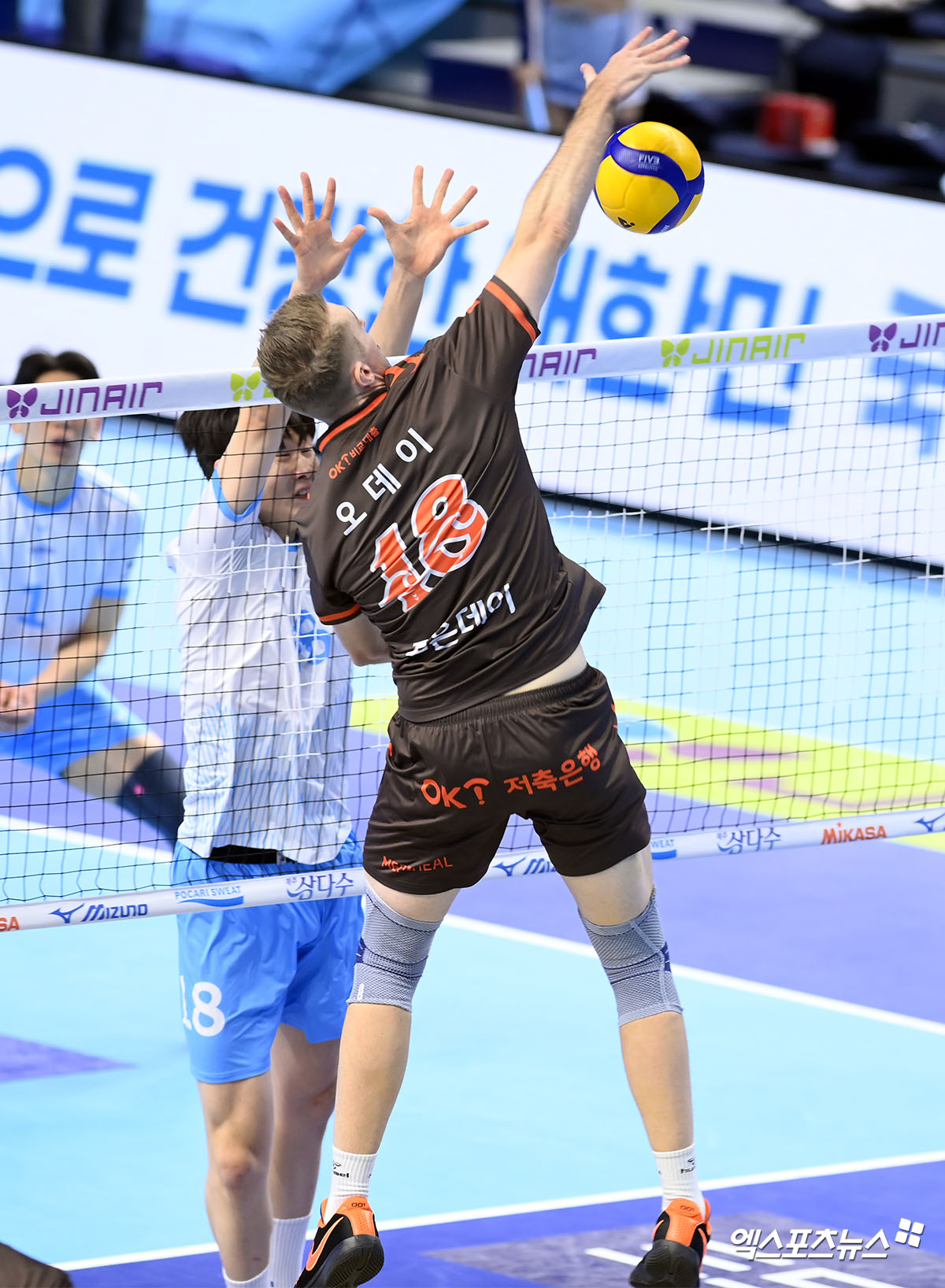 (엑스포츠뉴스 인천, 고아라 기자) 13일 오후 인천 계양체육관에서 열린 '진에어 2025-2026 V-리그' 대한항공과 OK저축은행의 경기, OK 오데이가 공격을 시도하고 있다.