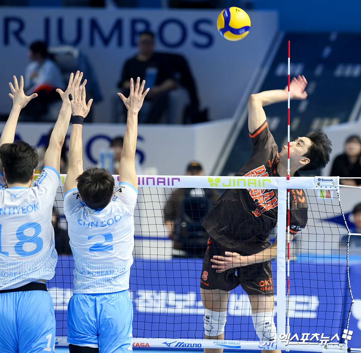 (엑스포츠뉴스 인천, 고아라 기자) 13일 오후 인천 계양체육관에서 열린 '진에어 2025-2026 V-리그' 대한항공과 OK저축은행의 경기, OK 차지환이 공격을 시도하고 있다.