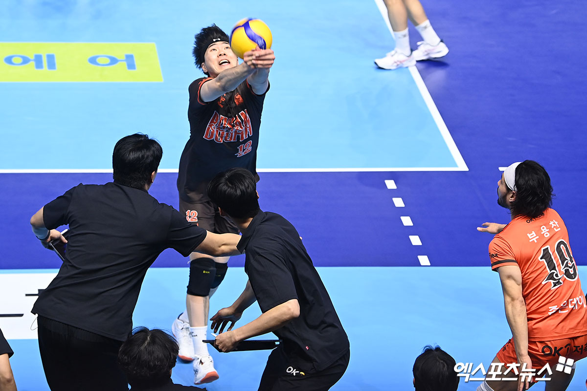 (엑스포츠뉴스 인천, 고아라 기자) 13일 오후 인천 계양체육관에서 열린 '진에어 2025-2026 V-리그' 대한항공과 OK저축은행의 경기, OK저축은행 전광인이 디그를 시도하고 있다.