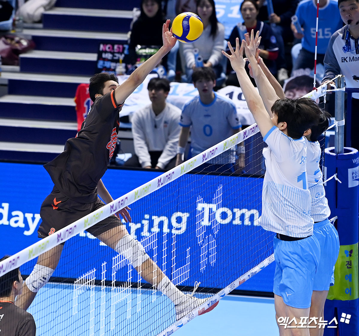 (엑스포츠뉴스 인천, 고아라 기자) 13일 오후 인천 계양체육관에서 열린 '진에어 2025-2026 V-리그' 대한항공과 OK저축은행의 경기, OK저축은행 차지환이 공격을 시도하고 있다.