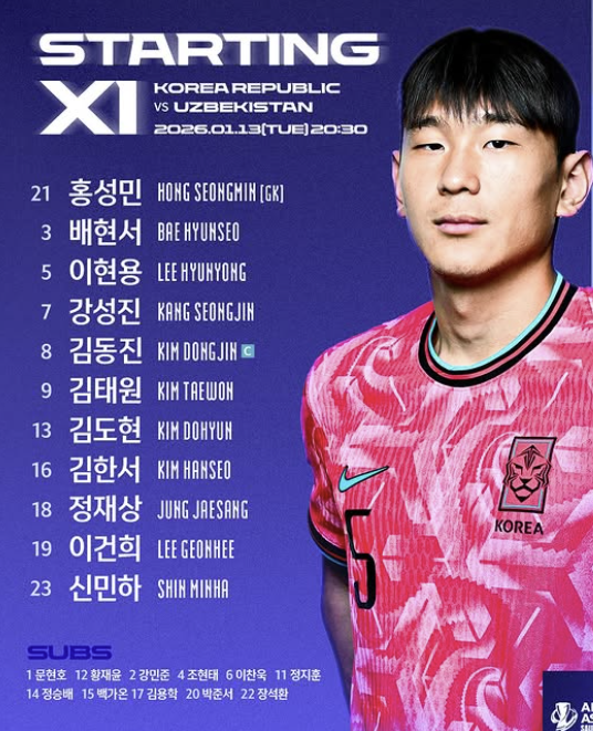 이민성호는 13일(한국시간) 오후 8시30분부터 사우디아라비아 리야드 프린스 파이살 빈 파드 스포츠시티 경기장에서 킥오프한 2026 아시아축구연맹(AFC) U-23 아시안컵 조별리그 C조 최종전 우즈베키스탄과의 맞대결에서 후반 3분 만에 상대 베루존 카리모프에 선제골을 내줬다.